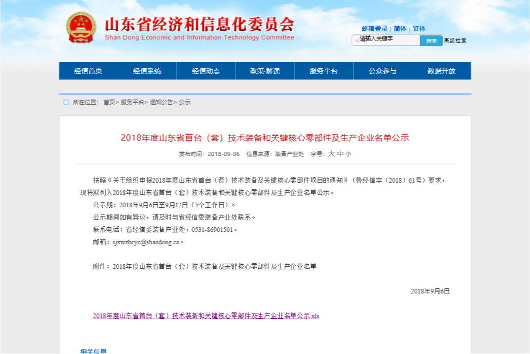 2018年度山東省首臺(tái)(套)技術(shù)裝備和關(guān)鍵核心零部件及生產(chǎn)企業(yè)名單公示