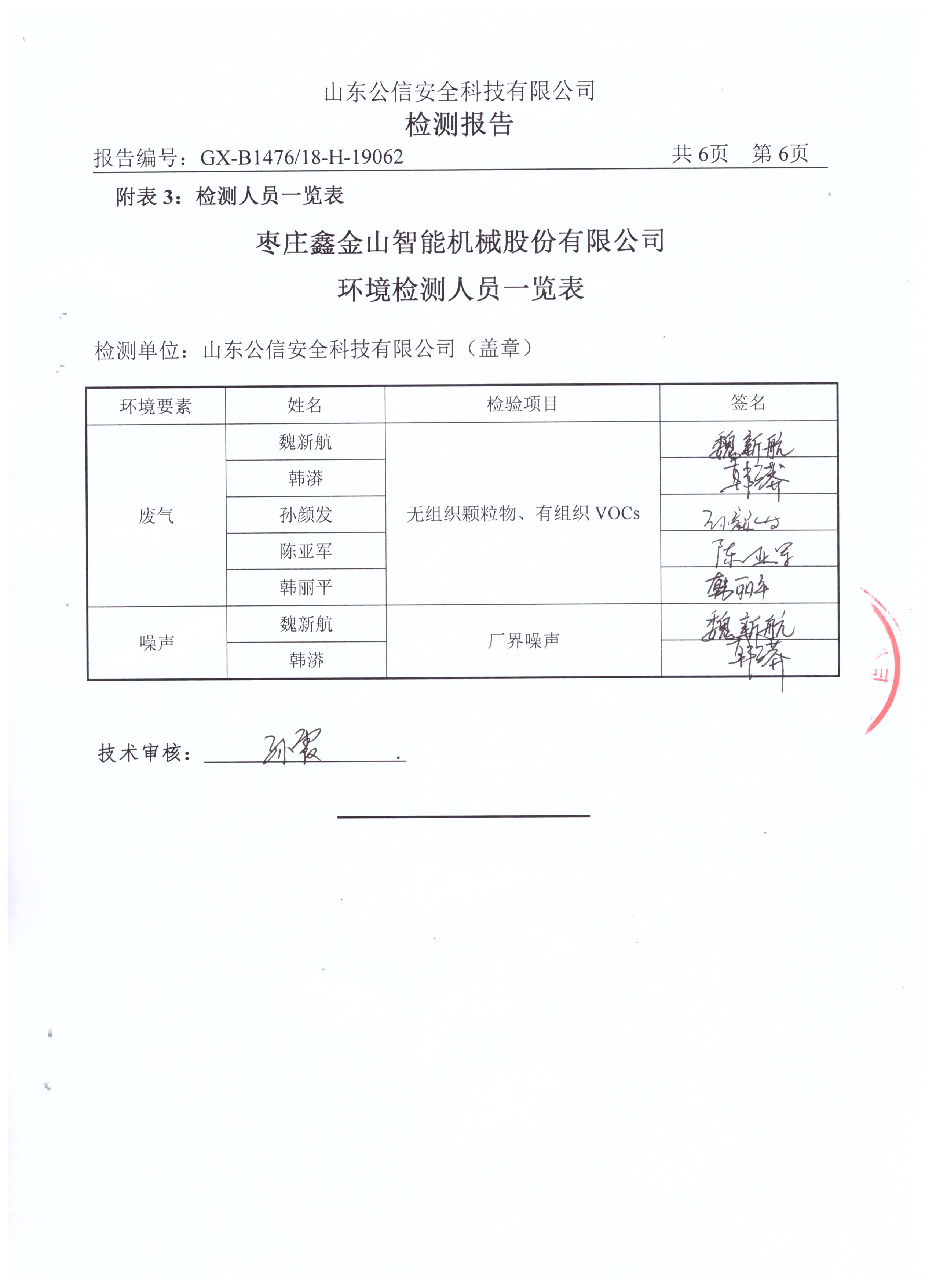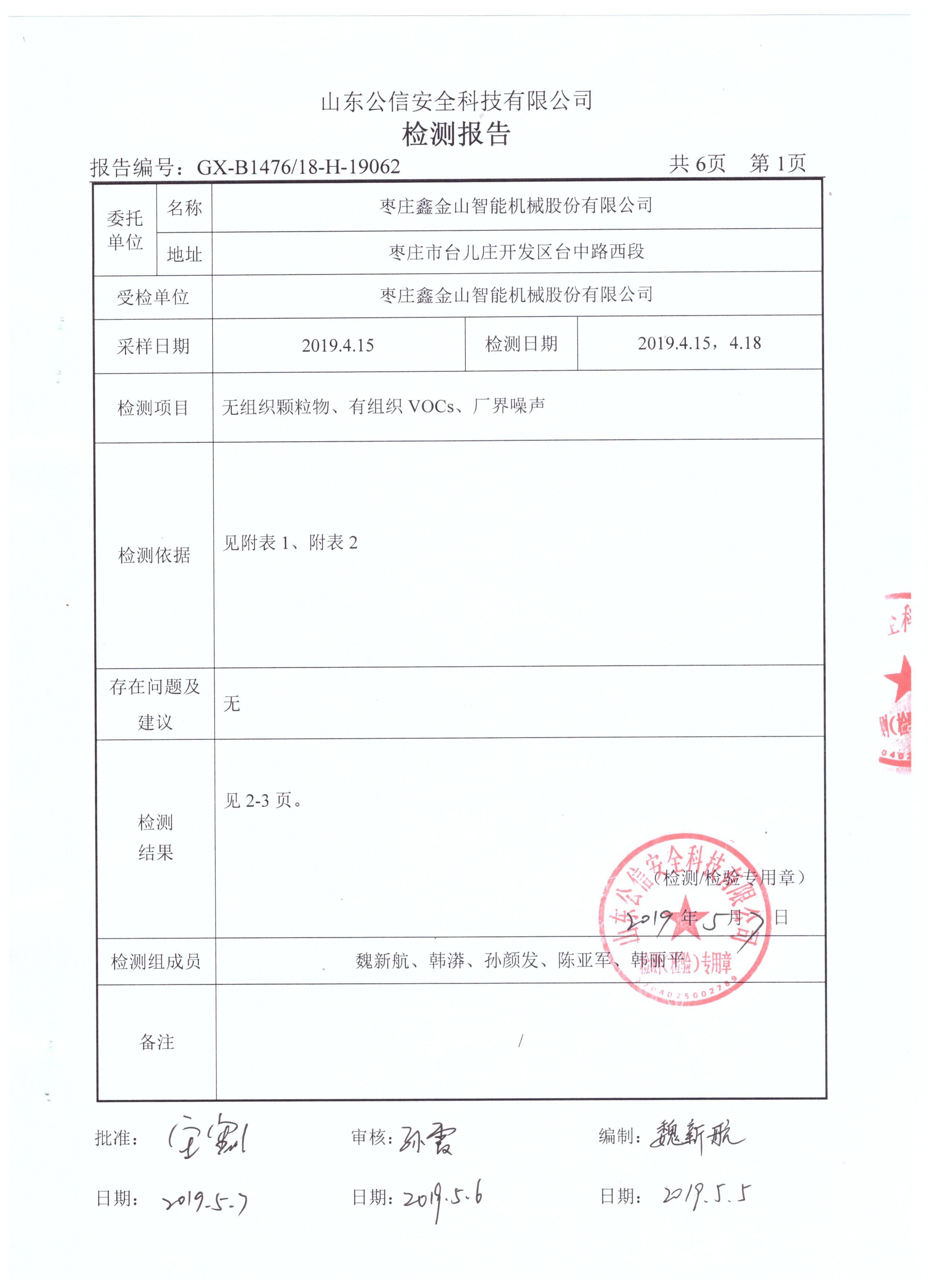 導(dǎo)讀:受檢單位:棗莊鑫金山智能機(jī)械股份有限公司 委托單位:山東公信安全科技有限公司 檢測(cè)日期:2019.4.15 2019.4.18