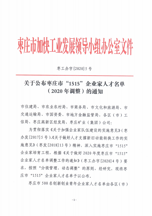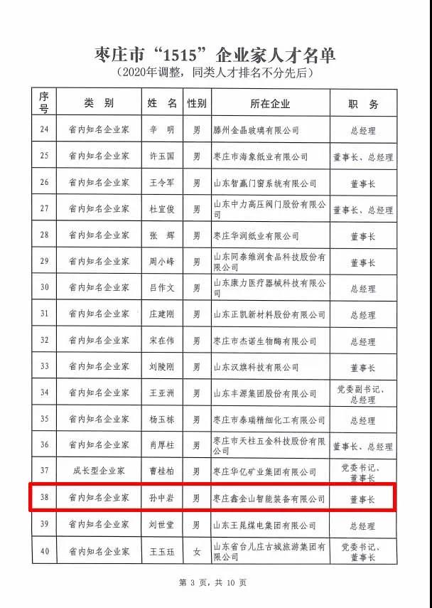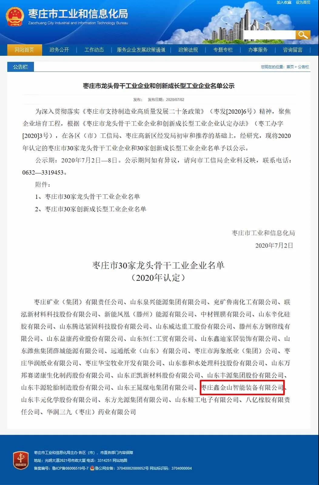 導讀:近日,從棗莊市工業(yè)和信息化局傳來喜訊,正式公示了2020年棗莊市龍頭骨干工業(yè)企業(yè)和創(chuàng)新成長型工業(yè)企業(yè)名單以及棗莊市“1515”企業(yè)家人才名單,棗莊鑫金山智能裝備有限公司榜上有名,成功榮獲“棗莊市龍頭骨干企業(yè)”殊榮,董事長孫中巖榮獲棗莊市“1515”企業(yè)家榮譽稱號。