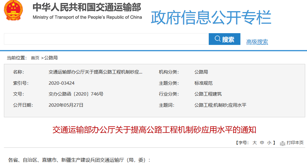 日前,交通運(yùn)輸部辦公廳印發(fā)《關(guān)于提高公路工程機(jī)制砂應(yīng)用水平的通知》,推動(dòng)和規(guī)范機(jī)制砂在公路工程中的應(yīng)用,并提供了兩項(xiàng)地方公路工程機(jī)制砂應(yīng)用標(biāo)準(zhǔn)。
