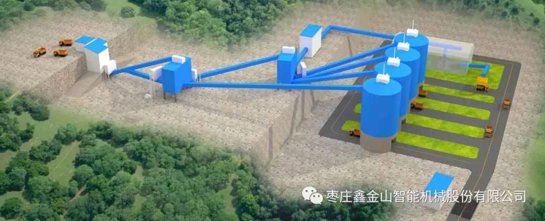 采用鑫金山公司主打的高效能、短流程工藝設(shè)計(jì),進(jìn)行系統(tǒng)集成,對(duì)給料、破碎、輸送、篩分、存儲(chǔ)和環(huán)保等五大系統(tǒng)進(jìn)行智能整合。主機(jī)使用鑫金山的guojia專利產(chǎn)品——新型單段重錘反擊破,由于該機(jī)一次成型率高達(dá)80%,生產(chǎn)工藝中無需配置回料破,進(jìn)一步節(jié)約了場(chǎng)地與能耗,增加了廠區(qū)綠化面積,比傳統(tǒng)工藝省電50%以上,破碎1噸石料僅需0.5度電;在環(huán)保方面,將水霧除塵、脈沖袋式除塵組合使用,可將顆粒濃度控制在10?/m3以內(nèi);在智能化方面,鑫金山獨(dú)立開發(fā)的智能DCS系統(tǒng)將多個(gè)智能系統(tǒng)進(jìn)行并聯(lián)實(shí)現(xiàn)了中央集控,并將數(shù)據(jù)實(shí)時(shí)傳送至“金山云”進(jìn)行大數(shù)據(jù)統(tǒng)計(jì)分析,同時(shí)配自動(dòng)裝車、自動(dòng)購銷、無人值守系統(tǒng),將生產(chǎn)線打造成名副其實(shí)的高度智能化砂石骨料生產(chǎn)線。