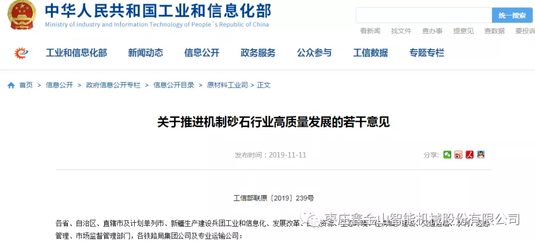 近日,為大力推廣機(jī)制砂,促進(jìn)機(jī)制砂產(chǎn)業(yè)健康發(fā)展,工業(yè)和信息化部、guojia發(fā)展改革委、自然資源部、生態(tài)環(huán)境部、住房城鄉(xiāng)建設(shè)部、交通運(yùn)輸部、水利部、市場監(jiān)管總局和國鐵集團(tuán)等guojia十部門聯(lián)合發(fā)布《關(guān)于推進(jìn)機(jī)制砂石行業(yè)高質(zhì)量發(fā)展若干意見》,是有史以來guojia關(guān)于砂石行業(yè)發(fā)展的首個(gè)指導(dǎo)意見,也是中國砂石行業(yè)歷史性轉(zhuǎn)折的里程碑,標(biāo)志著中國砂石行業(yè)從2019年正式進(jìn)入高質(zhì)量發(fā)展的新時(shí)代。