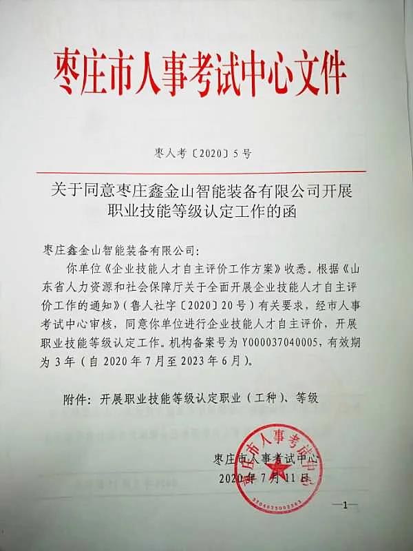 經過評估審核,于今年7月中旬成功得到市人事考試中心的正式批復,同意鑫金山進行企業(yè)技能人才自主評價,開展職業(yè)技能等級認定的工作。并取得自主開展車工、銑工、鏜工、沖壓工、鉗工、電工等8個職業(yè)(工種),5個等級的職業(yè)技能等級認定資質。