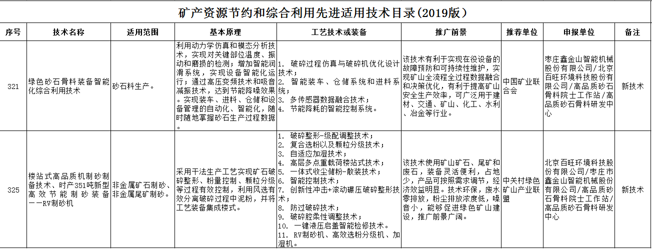 導(dǎo)讀:2019年12月,國家自然資源部辦公廳發(fā)布了關(guān)于《礦產(chǎn)資源節(jié)約和綜合利用先進(jìn)適用技術(shù)目錄(2019版)》的公示,棗莊鑫金山智能機(jī)械股份有限公司的樓站式高品質(zhì)機(jī)制砂制備技術(shù)、時產(chǎn)351噸新型高效節(jié)能制砂裝備——RV制砂機(jī)和綠色砂石骨料裝備智能化綜合利用技術(shù)作為新技術(shù)成功入選,這兩項先進(jìn)適用技術(shù)分別由中關(guān)村綠色礦山產(chǎn)業(yè)聯(lián)盟和中國礦業(yè)聯(lián)合會推薦。