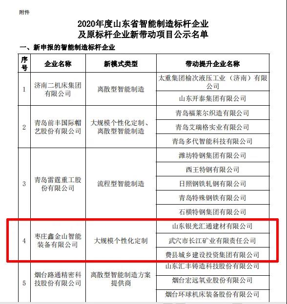 近日,省工業(yè)和信息化廳對(duì)獲評(píng)2020年度山東省智能制造標(biāo)桿企業(yè)及原標(biāo)桿企業(yè)新帶動(dòng)項(xiàng)目名單進(jìn)行了公示,棗莊鑫金山智能裝備有限公司成功入選,成為了2020年度山東省首批智能制造標(biāo)桿企業(yè)之一。